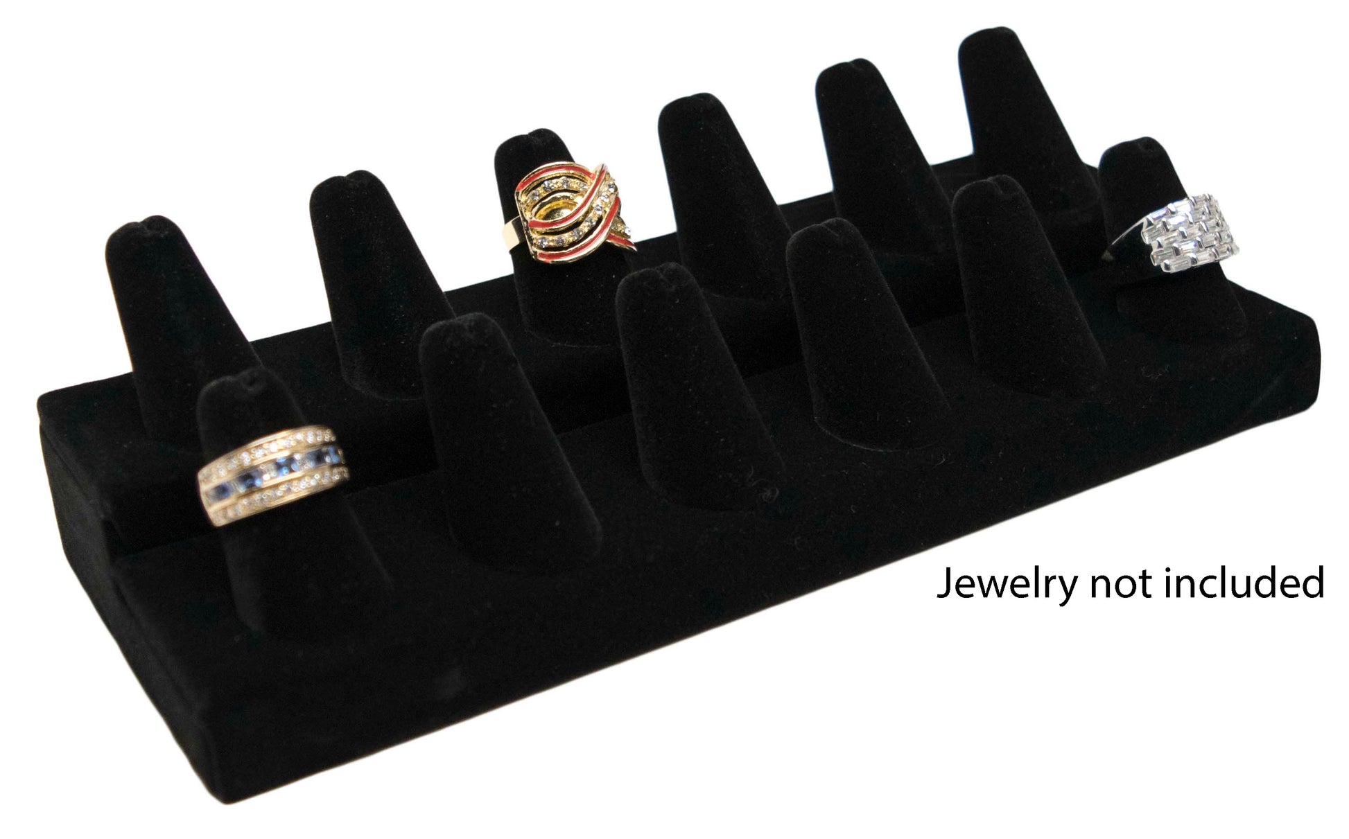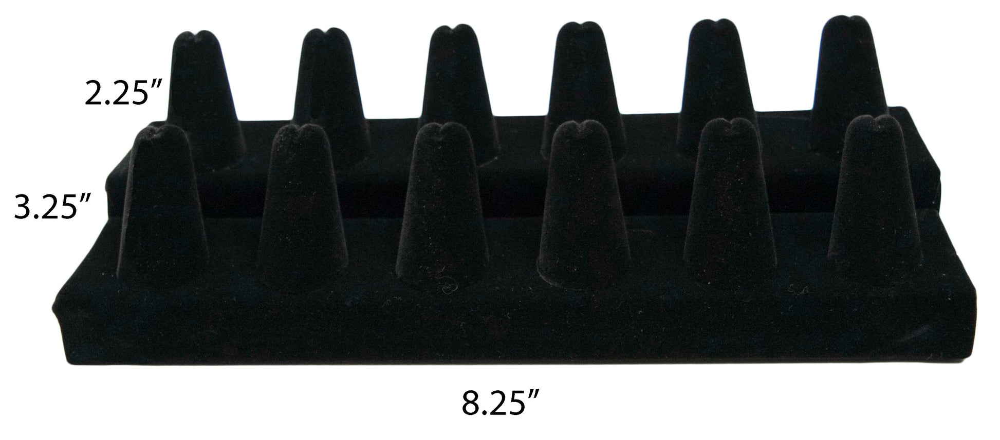 Description: 12 Fingers Display. This Classic ring finger display with twelve ring fingers, six in each row creates a tiered effect which helps bring focus to your rings. Simply slide rings onto the ring finger display and place in your jewelry case or in your window to create a lovely diplay. This display comes in Black Velvet or White Leatherette. ***Jewlery not included