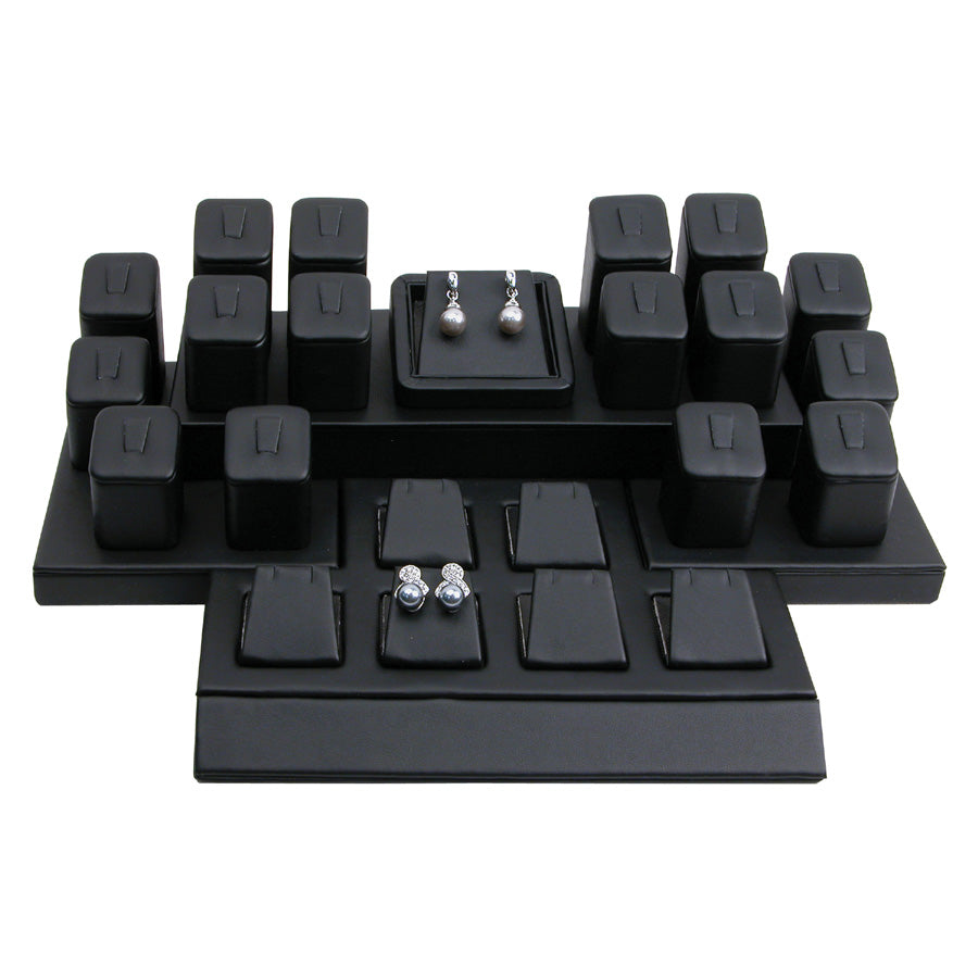 Description: Black Faux Leather 16-Ring & 7 Earring/Pendant Display Set. Available in 3 colors: all black faux leather, all white faux leather, and steel grey faux leather with black trim.