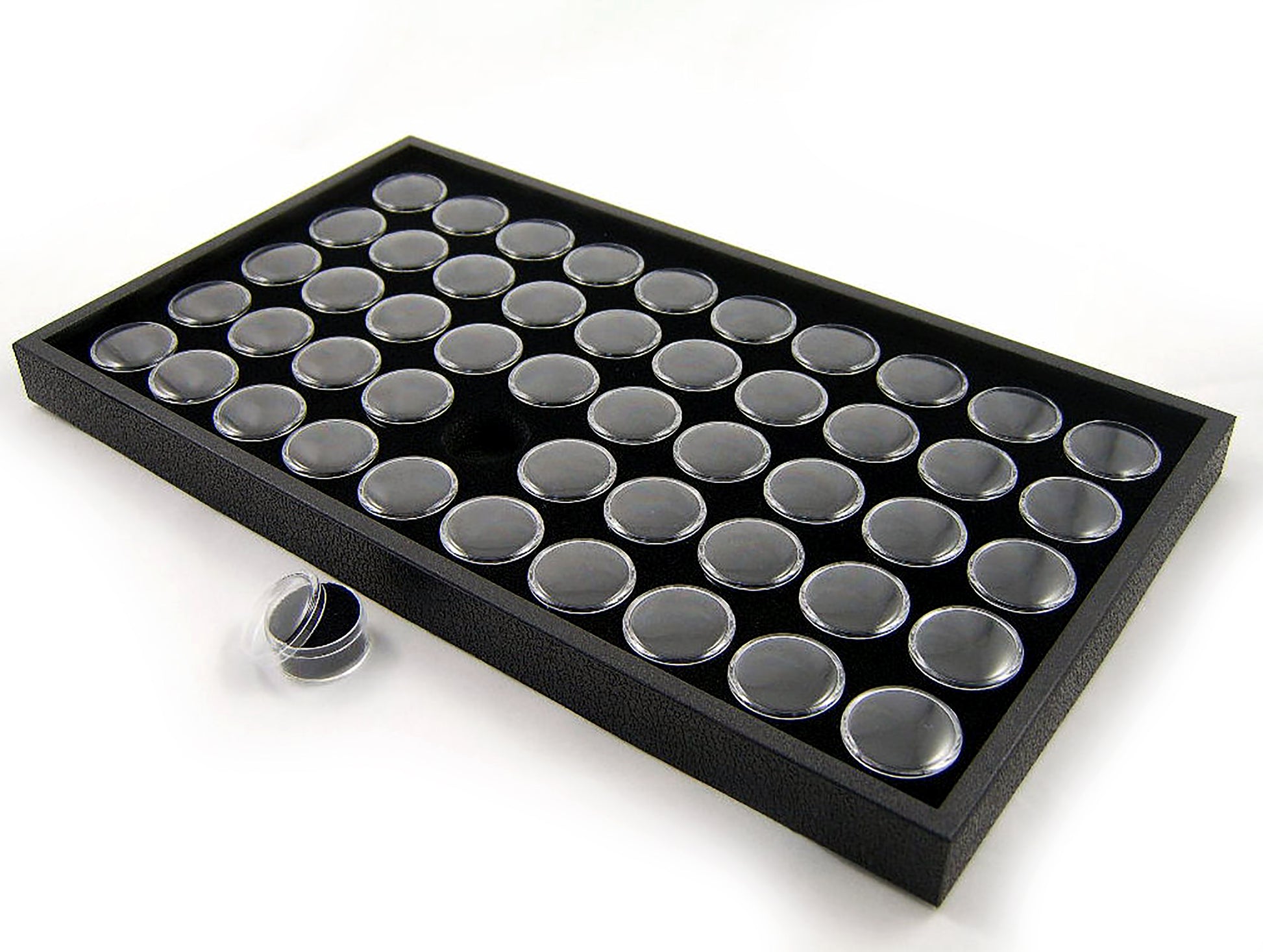 Description: Item includes Black Gem Tray & Lid, Tray size 14" x 8" x 1". Each tray comes with a foam insert with 50 gem jars. Gem jar size is 14" x 8" x 1" dia. *CHOOSE FOAM COLOR: BLACK OR WHITE.