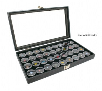 Description: Elegant display Hinged case with glass top and front latch that holds 36 gem jars. The inserts are removable. The latch/lock keeps all the jars in place for easier handling and safe keeping. Inserts available in black and white.