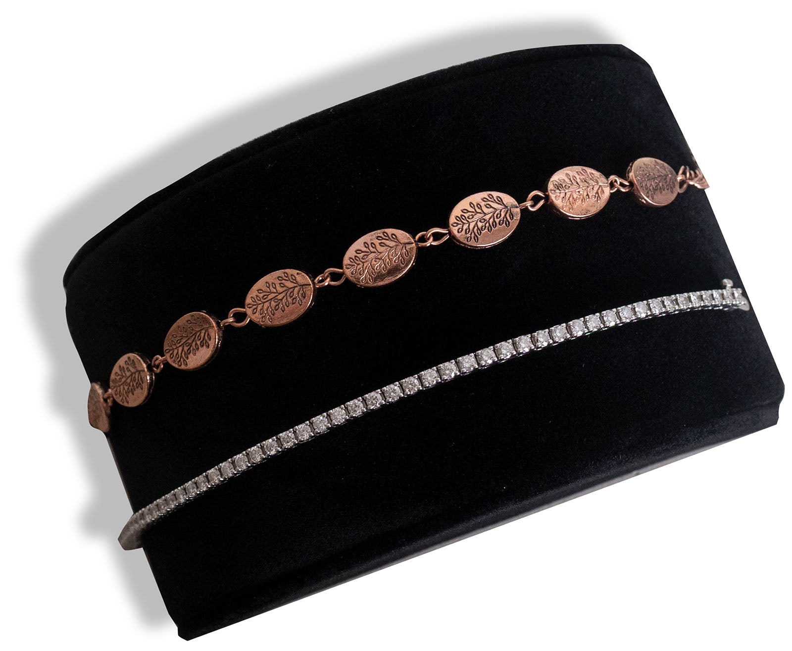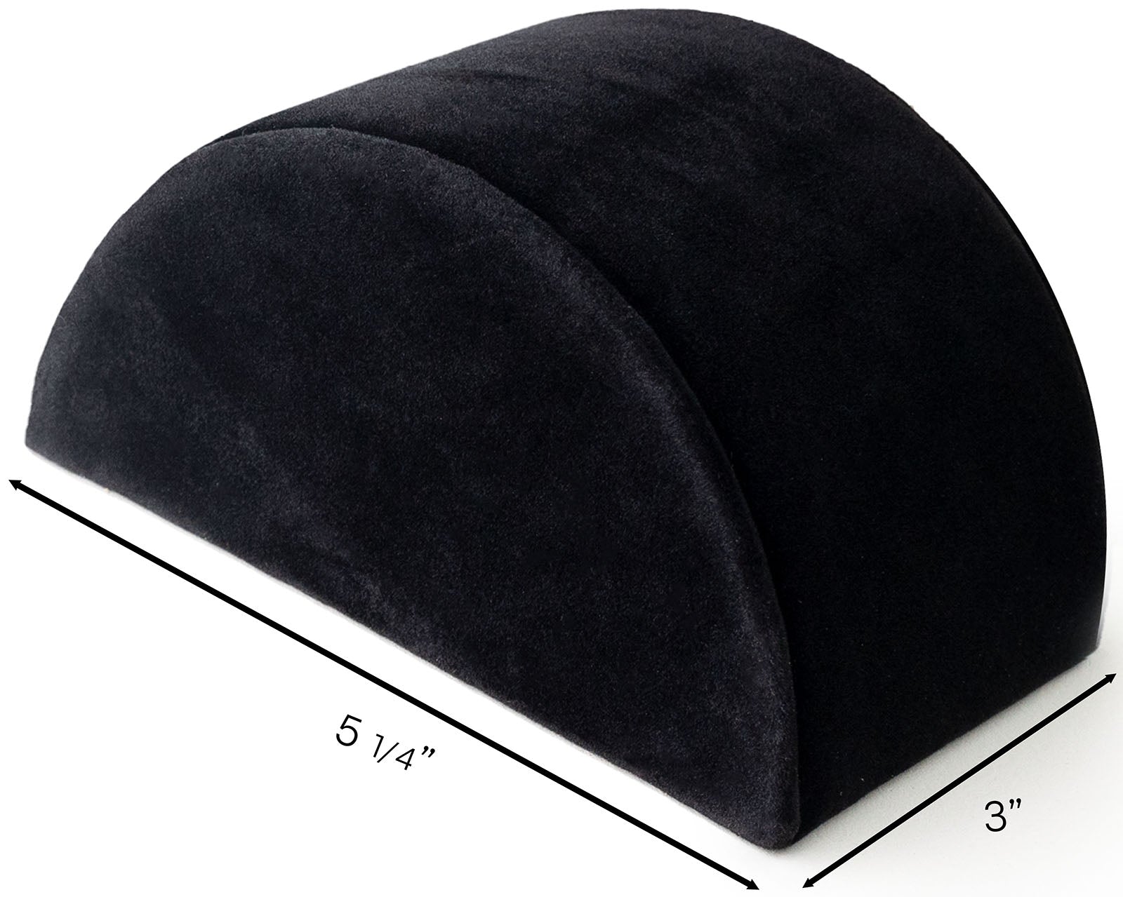 Description: Classic half moon bracelet display: A timeless way to showcase bracelets and watches of all sizes. Half moon shaped displays are designed so unclasped bracelets and watches can be draped across the display at an arched angle for optimal viewing. Display is covered in soft, durable black velvet fabric, providing great contrast for jewelry of all colors and materials. Core made up of rigid cardboard so displays are light and can be placed on a flat surface or stacked on a block-style display. Perfect for Jewelry Business or trade shows, even for home use