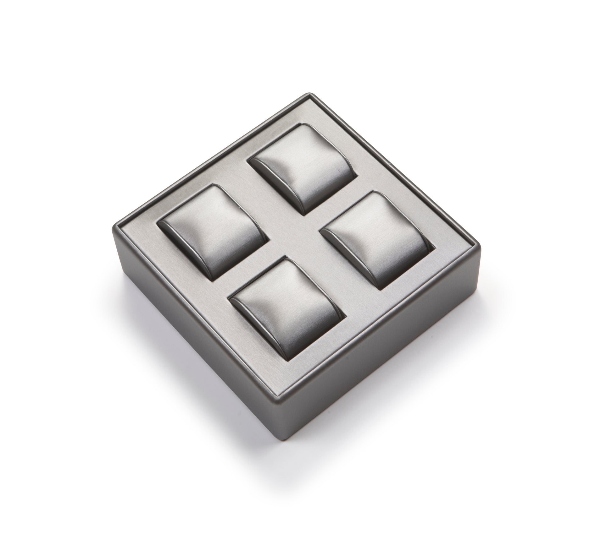 Description: Silver Gray Leatherette 4 Watch Tray offers a sleek and practical solution for displaying up to 4 watches. With its refined silver gray leatherette finish, this tray combines durability and elegance, making it perfect for retail displays or personal collections.