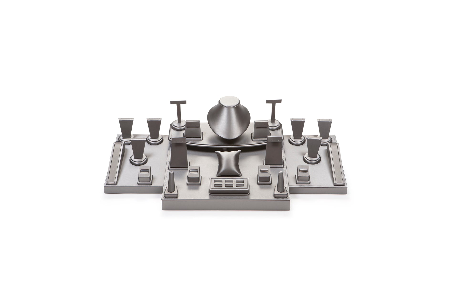 Description: Silver Gray Leatherette Showcase Display Set brings a touch of elegance and durability to your product displays. With its sleek silver gray leatherette finish, this display set is perfect for showcasing jewelry, accessories, or small collectibles, adding sophistication to any retail or exhibition environment.
