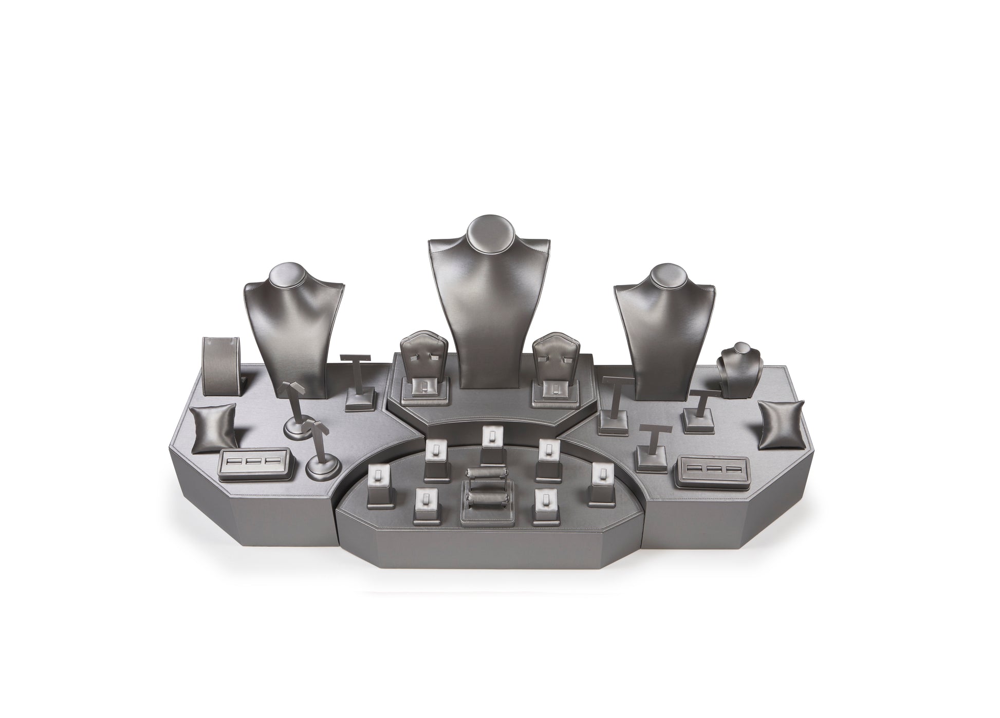 Description: Silver Gray Leatherette Window Display Set is the perfect blend of elegance and functionality, designed to elevate your product presentations. With its sleek silver gray leatherette finish, this display set is ideal for creating a sophisticated display in retail windows, trade shows, or exhibitions, ensuring your items stand out with style.