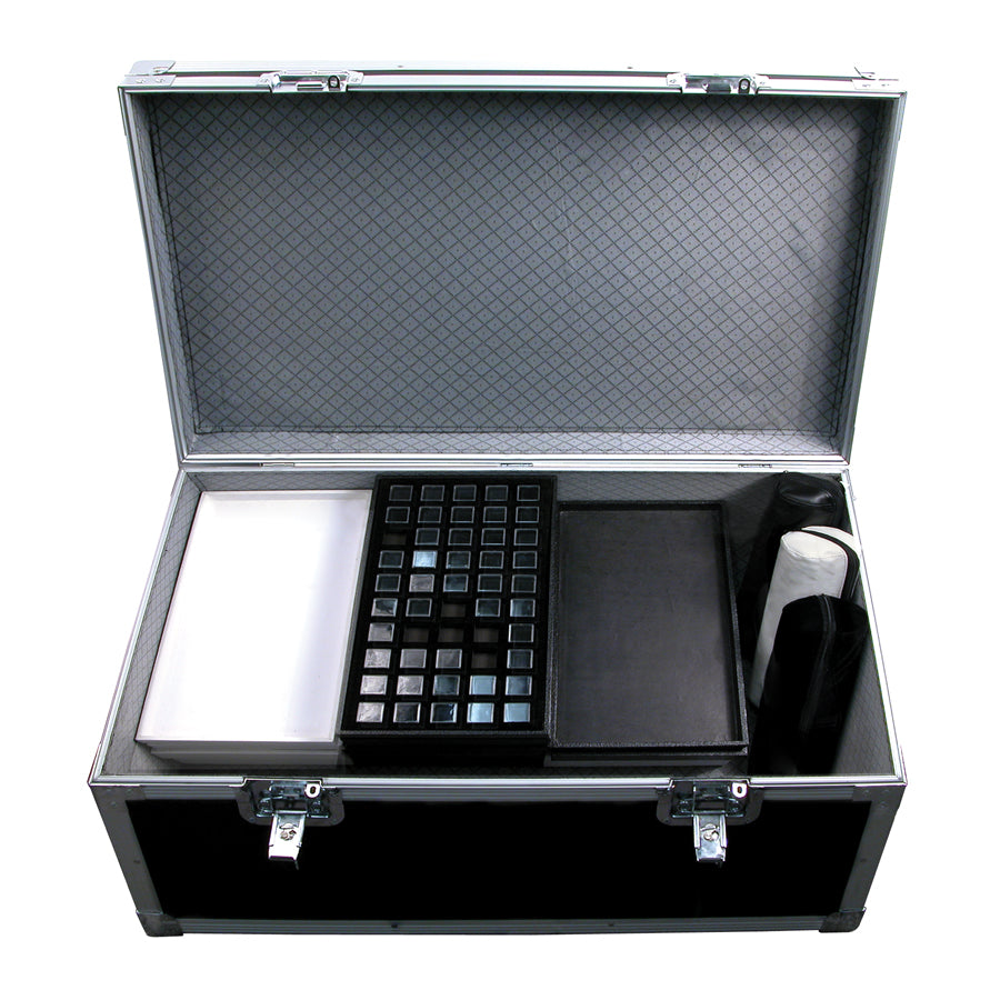 Description: Stackable Jewelry Trunk. This studry aluminum trunk features 2 locks to secure the trunk, sturdy handles, 4 Sturdy ball bearing wheels for easy towing. It fits 40 trays and the top opens for easy access. This trunk is accepted by most carriers. Perfect for all your fine jewlery traveling needs.
