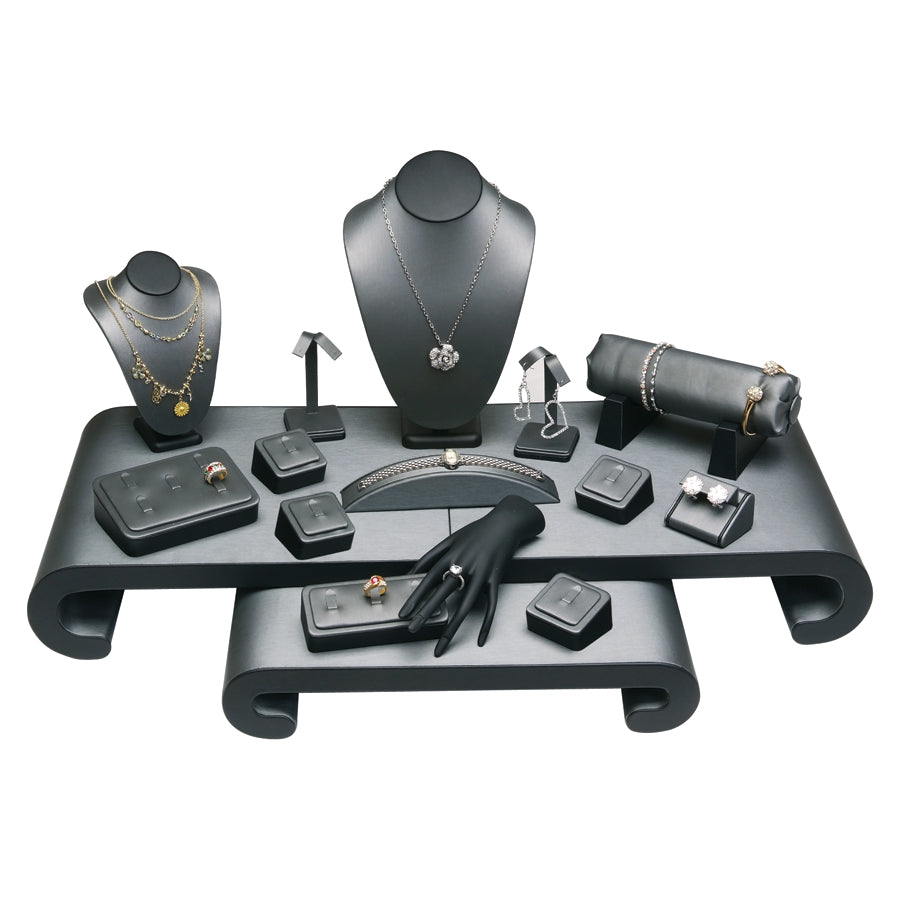 Description: Steel Grey Faux Leather with Black Faux Leather Trim. Also available in all white. This Set includes 1 x large bust, 1 x small bust, 1 x hand display, 1 x bangle bar, 1 x bracelet, 1 x flap earring, 2 x earring, 1 x ring, 1 x ring, 4 x ring, 1 x base.