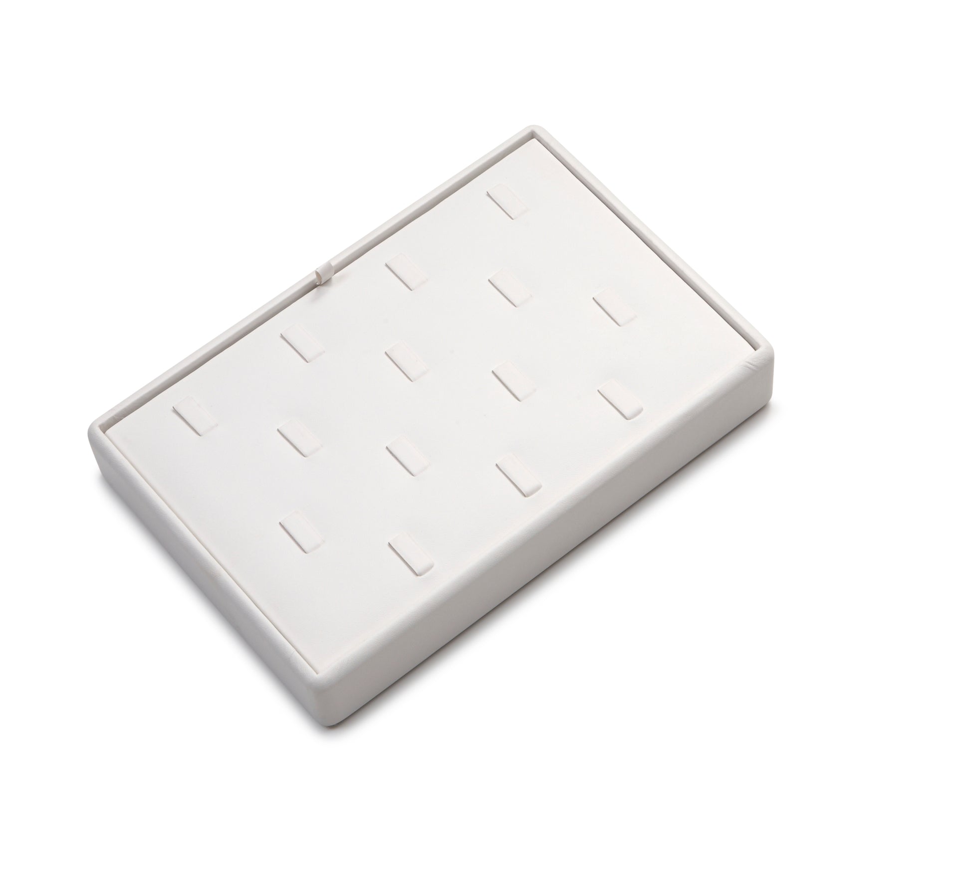 Description: White Leatherette 14 Clip Ring Tray. This tray is designed to securely hold and display up to 14 rings, making it ideal for jewelry stores and display cases.