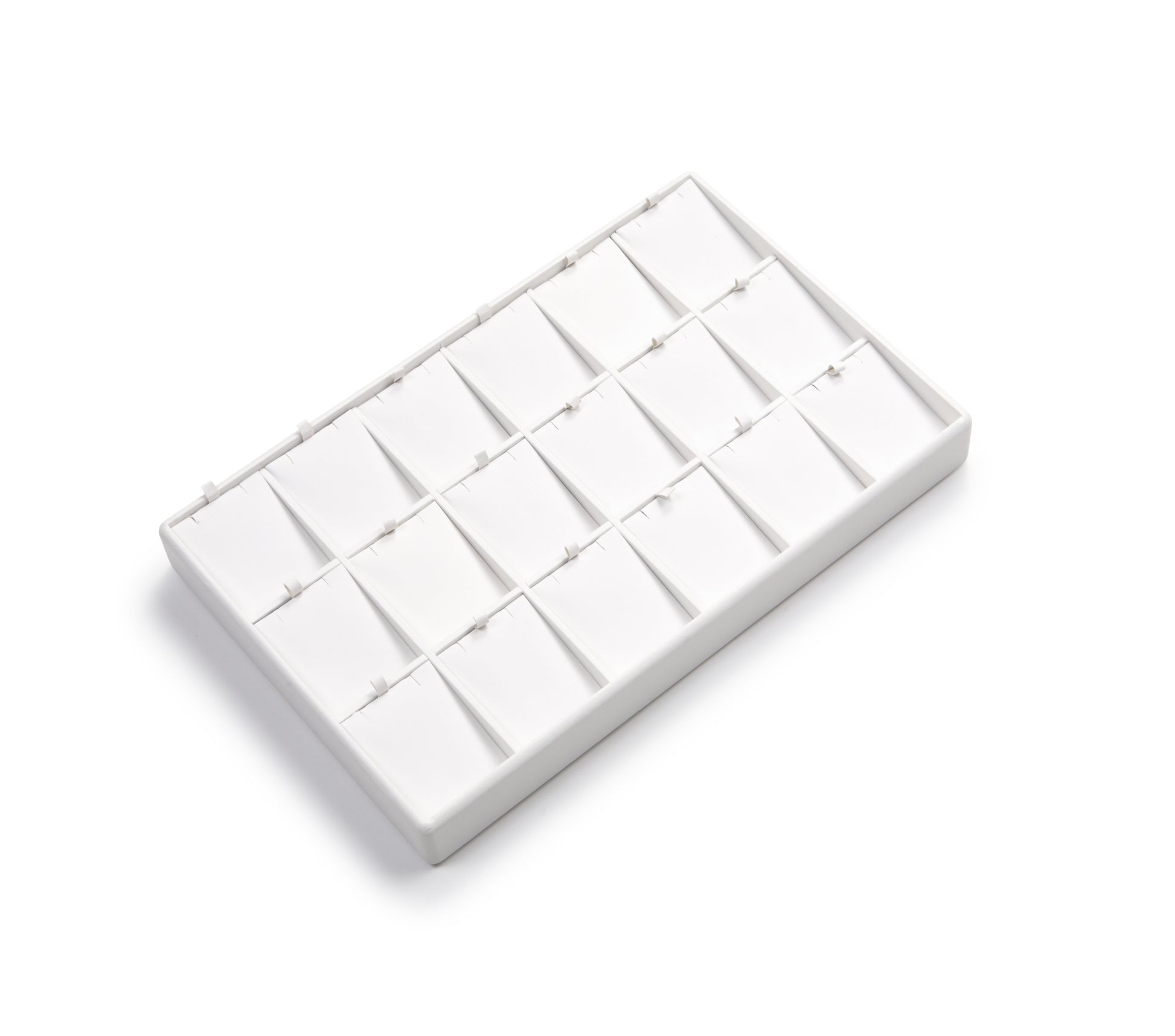 Description: White Leatherette 18 Pendant Tray designed to hold and showcase up to 18 pendants in a neat and organized manner. The elegant white leatherette finish enhances the visual appeal, making it perfect for retail displays, trade shows, or personal collections. Its structured design ensures that pendants stay securely in place while offering a professional presentation.