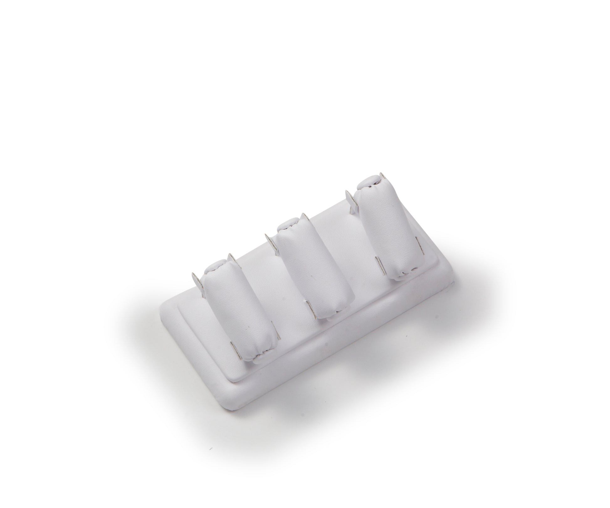 Description: This White Leatherette 3 Ring Stand is designed to elegantly display up to three rings. Its sleek leatherette finish provides a professional and stylish presentation, making it ideal for jewelry stores, showcases, or personal collections.