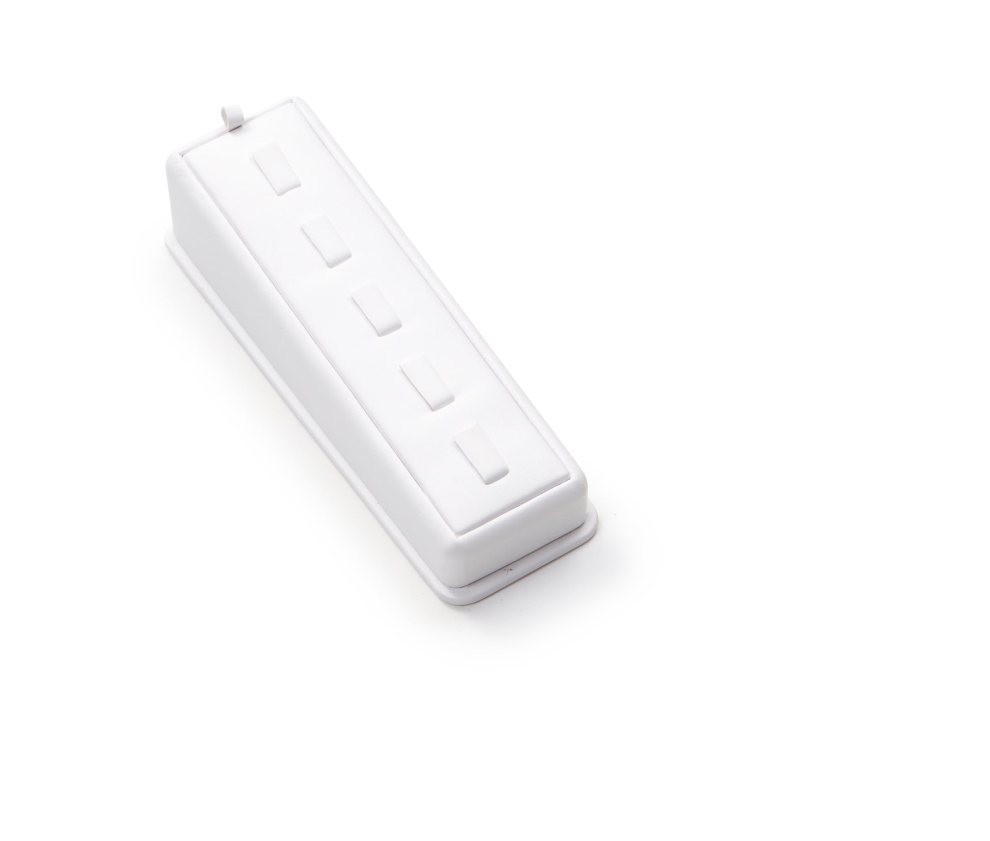 Description: White Leatherette 5 Clip Ring Stand. This stand is designed to elegantly hold and showcase five rings, making it perfect for jewelry stores and display cases.