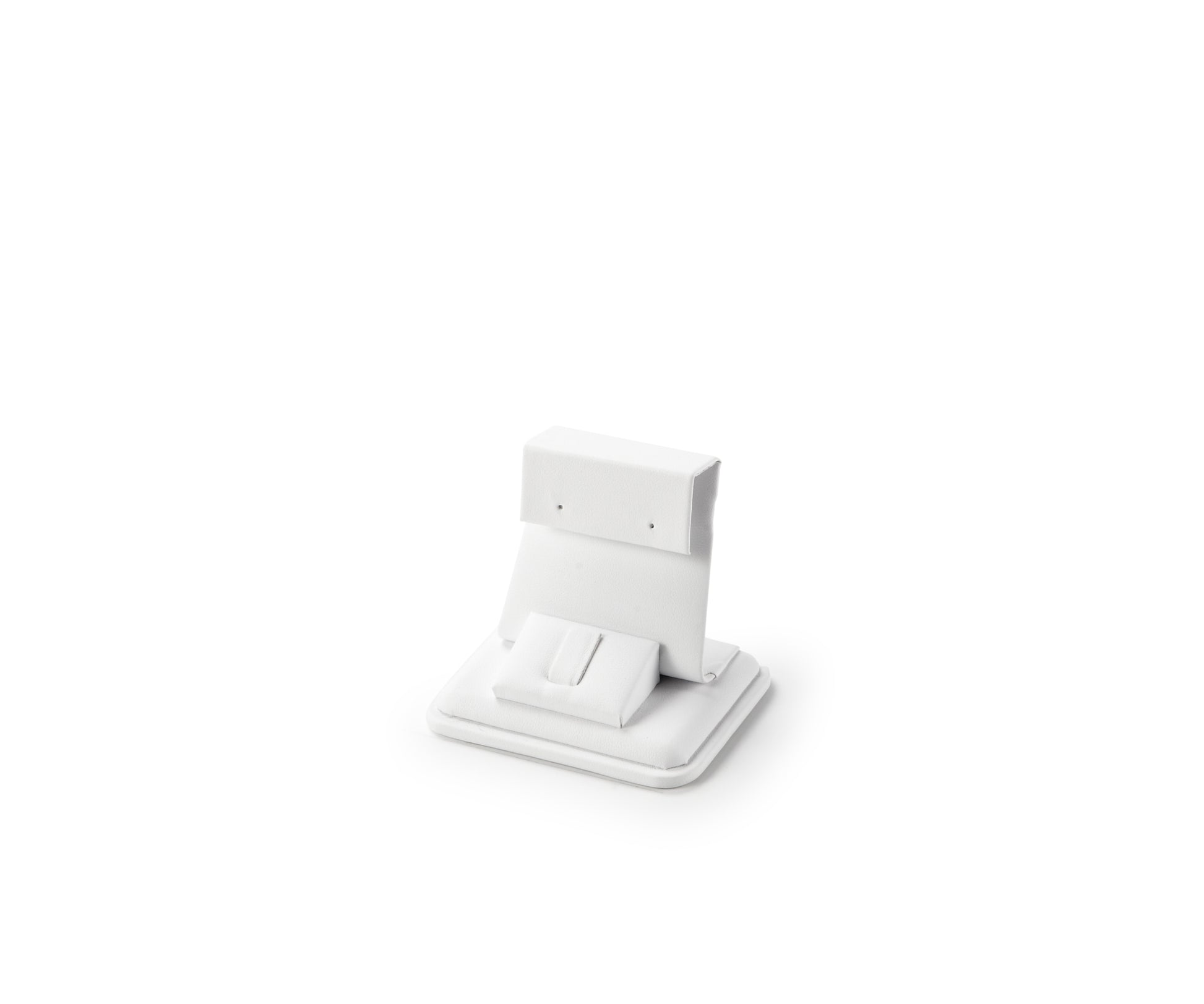 Description: This White Leatherette Earring/Ring Stand is designed to elegantly display both earrings and rings in a compact format. Perfect for showcasing jewelry in retail settings or personal collections, it provides a stylish and professional presentation.